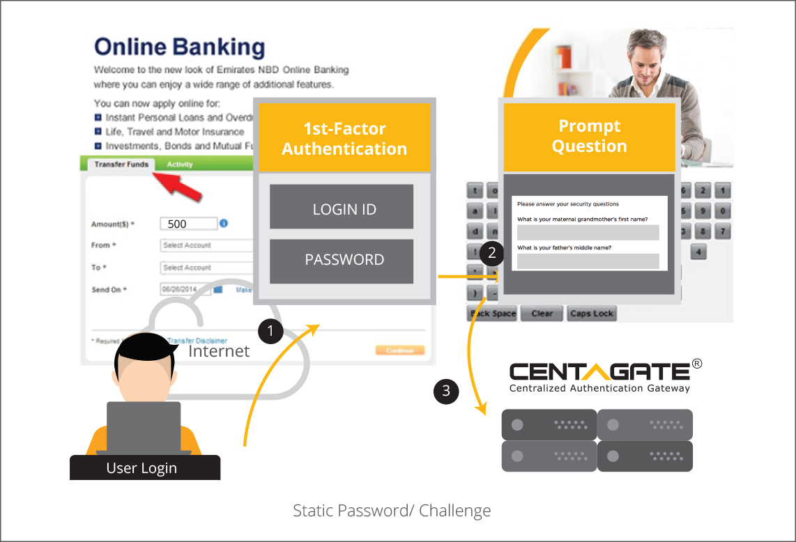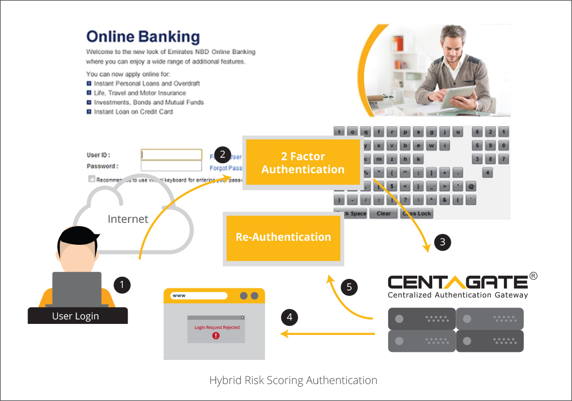(2) CENTAGATE® validates the 2-Factor Authentication token, if successful then CENTAGATE® evaluates risks score according to security policy configured. If the risk score is high, CENTAGATE® will either reject the login request or trigger to next step of authentication where the user will be prompted for re-authentication via different channels. Re-Authentication methods will subject to the configurable Trust level.